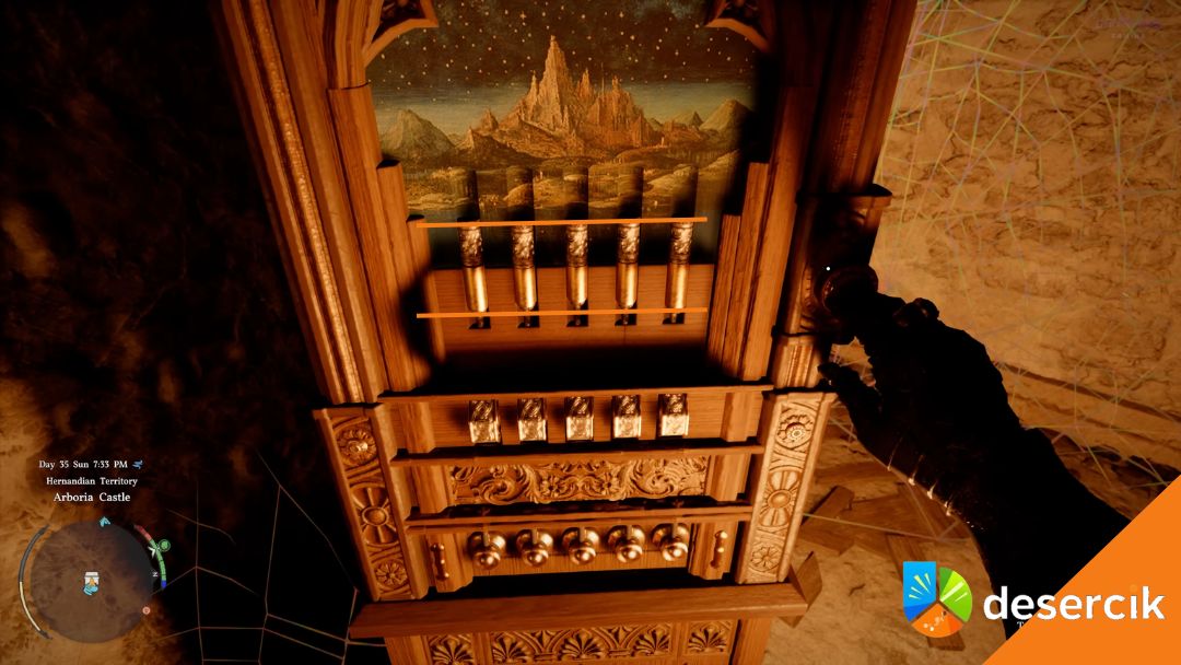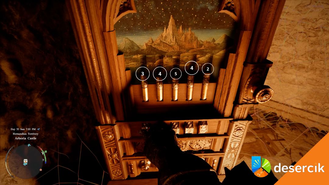 Mimo to, jeśli już tu jesteś i chcesz mieć to z głowy, pokażę ci dokładnie jak to rozwiązać. Zamek Arboria leży na północy, mniej więcej między Hernand a Demeniss. Wchodzisz do głównej części zamku i tam znajdziesz sejf, który od razu przyciąga uwagę. To nie jest klasyczna skrzynia. Masz tutaj mechanizm z cylindrami i obrotowymi elementami, który na początku nie daje żadnych jasnych wskazówek.
