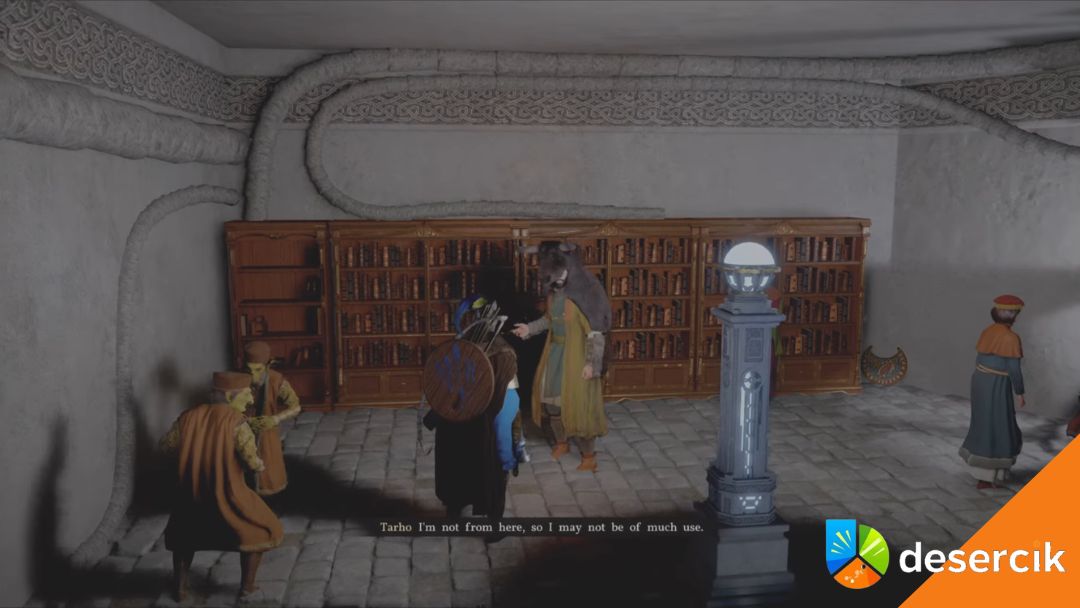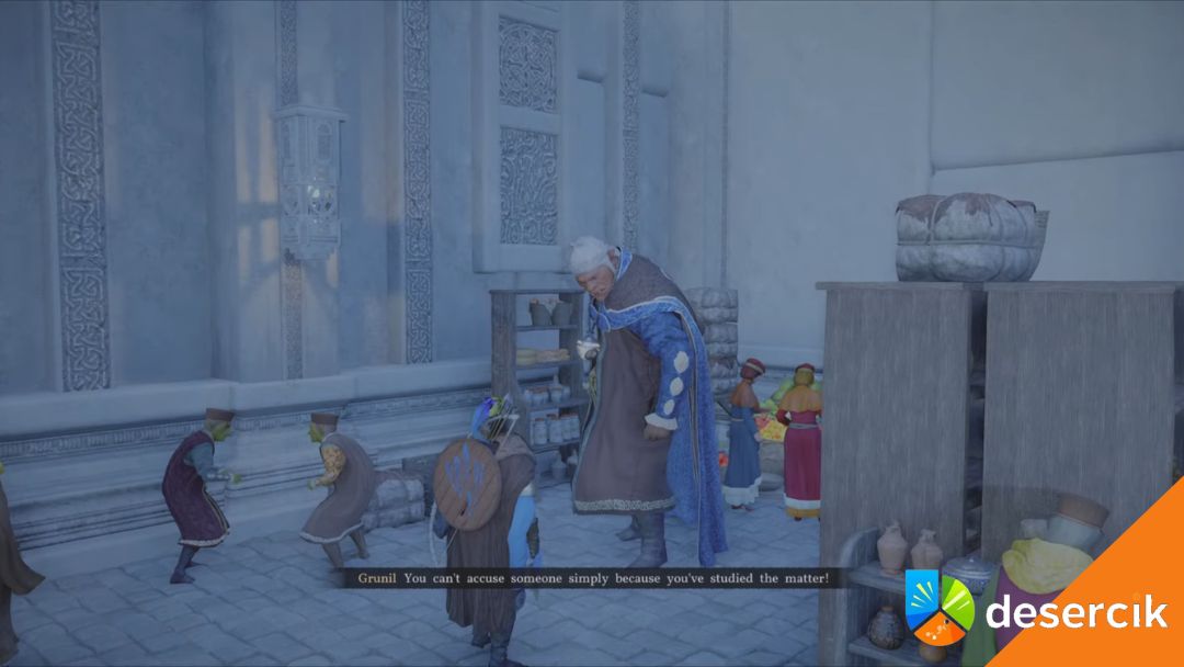 Grunil – ze strony bocznego wejścia do biblioteki podążajcie za markerem do Grunila. Jest jedyną osobą, która rozumie starożytny język. Spędził dzień pracując z Tarho, a jego podejrzenia padają na strażników, bo niektórzy nie rejestrują swojej wizyty w bibliotece.