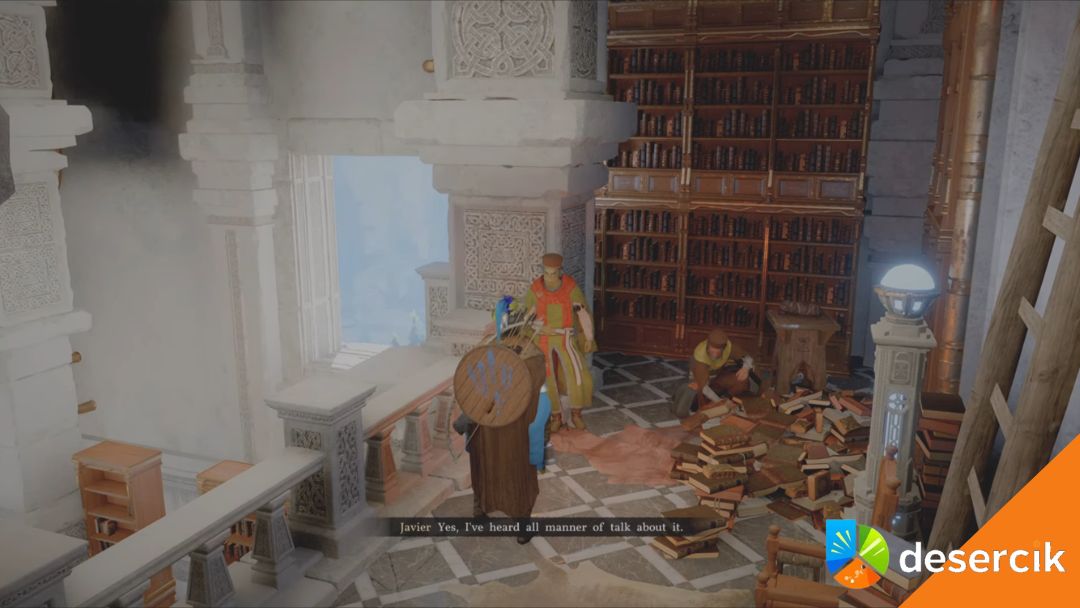 Javier – skręćcie na zachód i przemieśćcie się do jego lokalizacji. Gdy dotrzecie na wyższe piętro, porozmawiajcie z asystentem bibliotekarza. Javier twierdzi, że przebywa w bibliotece codziennie jako pomocnik i zakazana księga nic mu nie daje, bo nie zna starożytnego języka. Wskazuje, że problem mógłby leżeć poza instytutem – być może jest nim ktoś z zewnątrz.