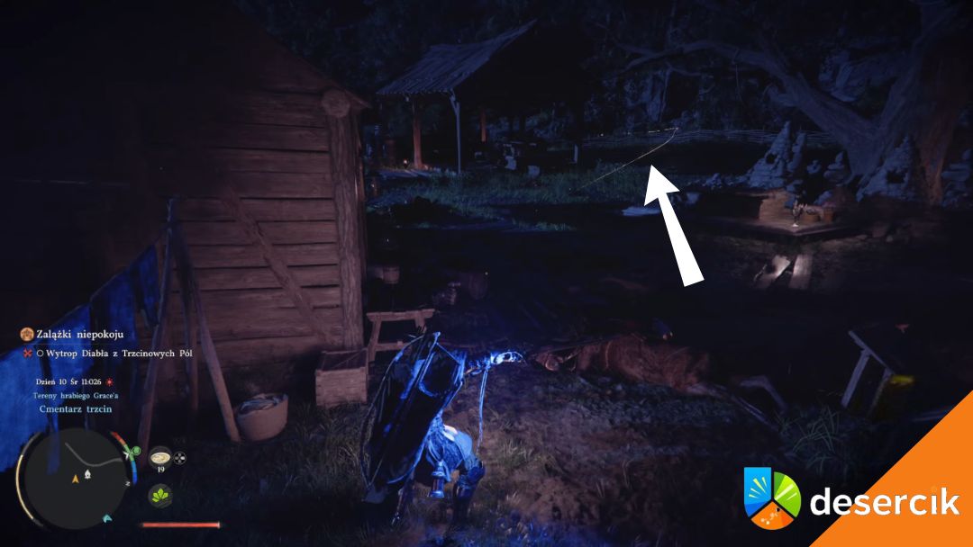 Po scenie w chacie zniknie znacznik misji, co może być mylące. Aby odnaleźć drogę, użyj latarni – ponownie pojawi się żółta linia tropu, prowadząca na południowy zachód od chaty, w stronę wąwozu.
