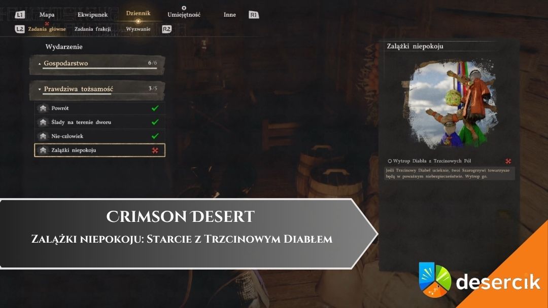 Zalążki niepokoju to 39. główna misja w Crimson Desert, w której ponownie ruszasz tropem „Diabła z Trzcinowych Pól”. Zadanie ma charakter pościgu z elementami walki i prowadzi przez wąwóz aż do miejsca o wyraźnie rytualnym charakterze.