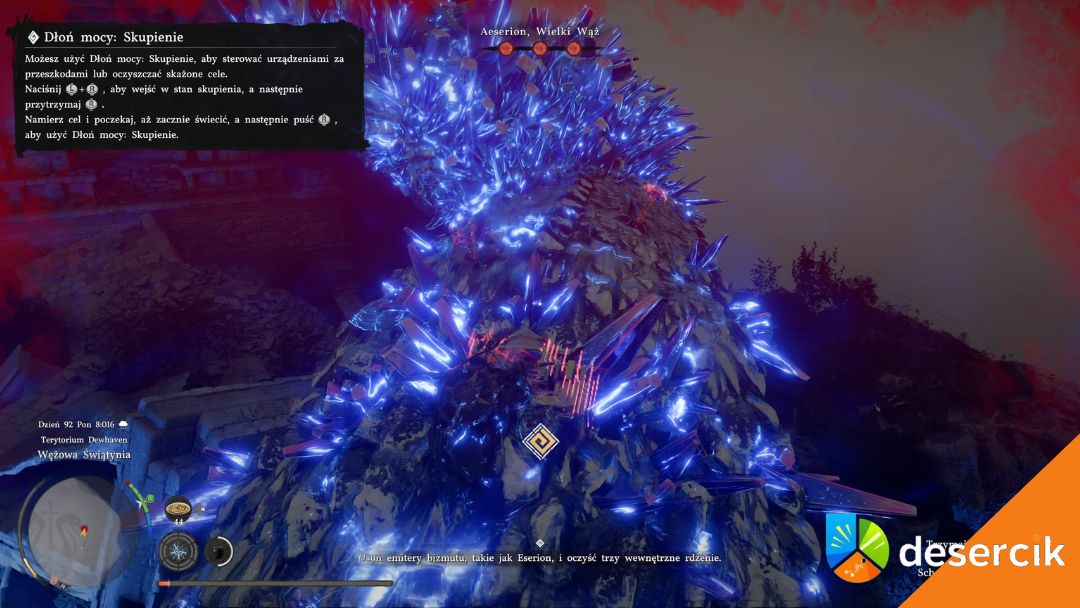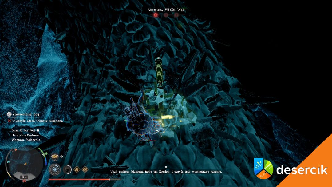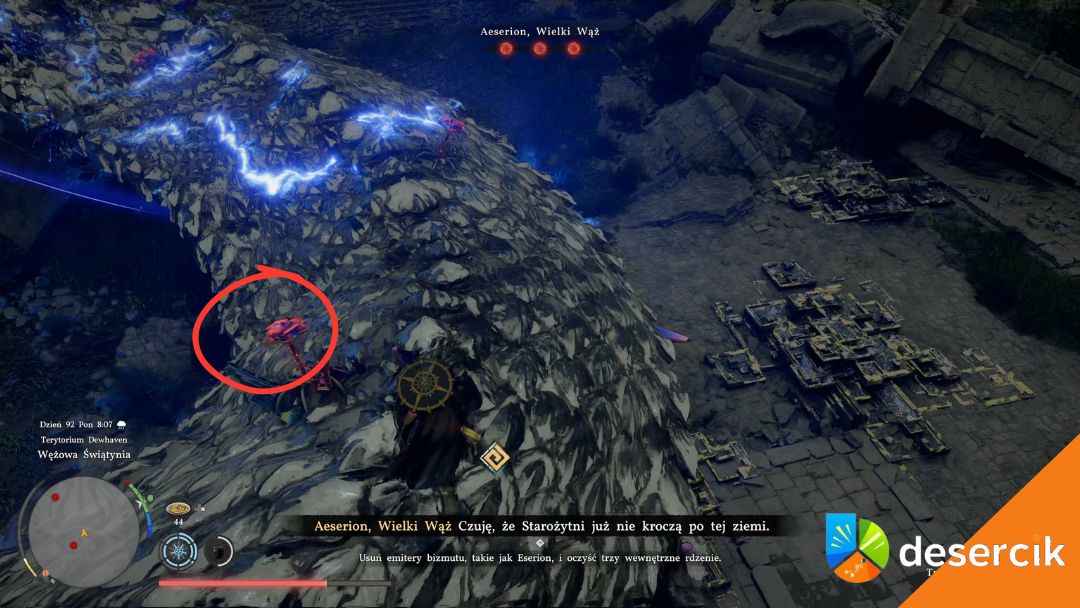 Kiedy masz już Starożytnych za sobą i wracasz do Wężowej Świątyni, zaczyna się właściwa część zadania. Na pierwszy rzut oka wygląda to jak starcie z ogromnym bossem, ale bardzo szybko okazuje się, że nie chodzi o zadawanie obrażeń samemu Aeserionowi. Klucz znajduje się na jego grzbiecie, gdzie rozmieszczone są trzy emitery – czerwone, wystające konstrukcje, które utrzymują go w niewoli.