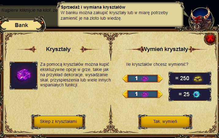 - Rozbudowa lochów i slotów – niektóre powiększenia i dodanie nowych slotów wymaga użycia kryształów.