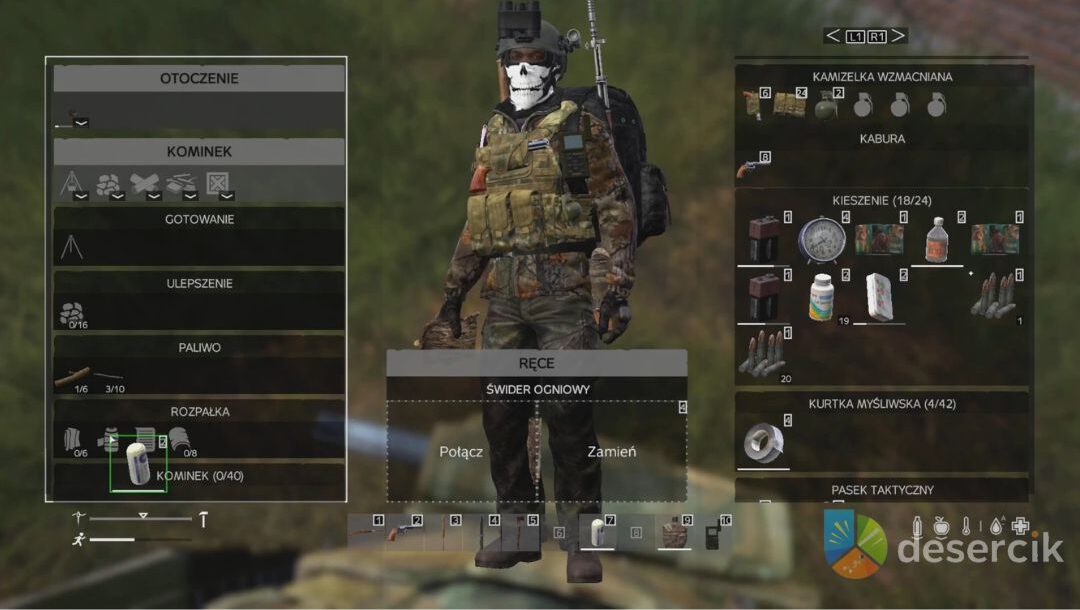 - Paliwo: Drewno opałowe (1-2 sztuki na start) i/lub krótkie kijki (2-3 sztuki). Drewno pali się dłużej, ale kijki są łatwiejsze do zebrania.