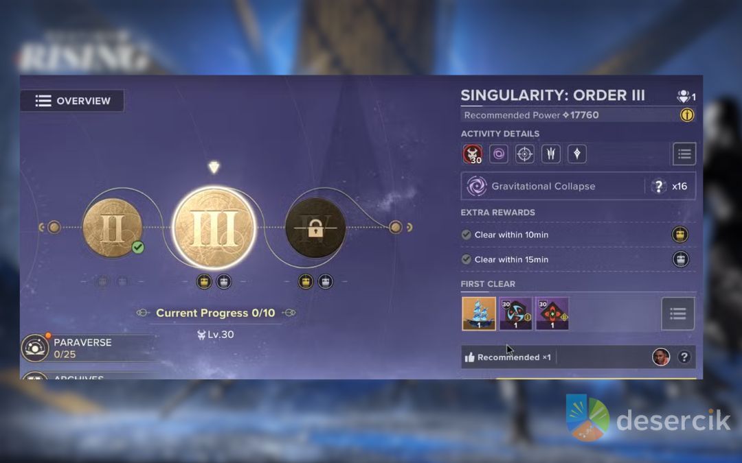- Singularity (PvE) – aktywność, która nagradza graczy Charmsami oraz innymi surowcami. Szczególnie cenne są nagrody za pierwsze ukończenie oraz dodatkowe premie za wykonanie misji w określonym czasie (np. poniżej 10 czy 15 minut).
