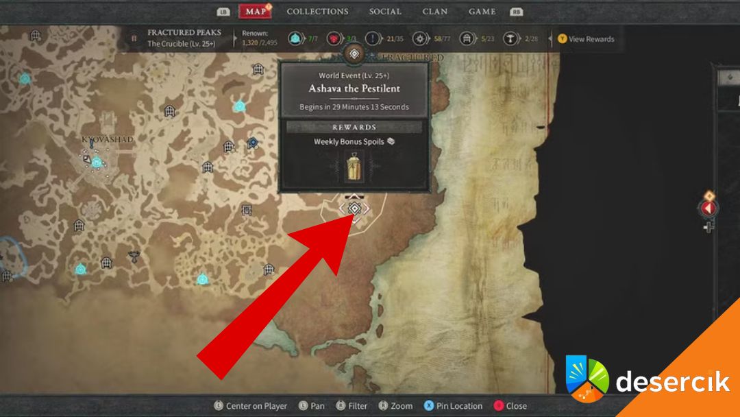 Aszawa pojawia się we wschodniej części mapy, w miejscu zwanym Tygiel. Kiedy dotrzesz na ten obszar, gra wyświetli ci licznik czasu do pojawienia się bossa, więc dokładnie wiesz, ile zostało do startu walki. To fajne rozwiązanie, bo możesz spokojnie przygotować się wcześniej, ogarnąć ekwipunek albo poczekać, aż zbierze się więcej graczy.