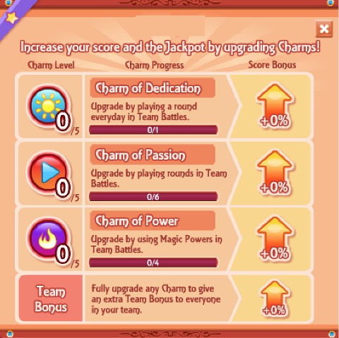 Zwiększ swój wynik i wielkość Jackpota ulepszając Uroki! Każde ulepszenie Uroku zwiększa Jackpot! W pełni ulepsz dowolny Urok, aby zapewnić dodatkowy bonus drużynowy wszystkim członkom zespołu. Członkowie obu drużyn dodają Złoto i Monety do Jackpota ulepszając Uroki! Ostateczny Jackpot jest dzielony między zwycięskich członków zespołu na podstawie ich wkładu w końcowy wynik!
