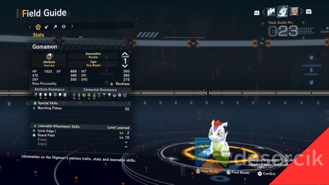 Gomamon to Digimon o atrybucie Vaccine, który specjalizuje się w atakach wodnych i lodowych, a także posiada umiejętność Guard Field na poziomie 10, podnoszącą Obrone wszystkich sojuszników o 10%. Jego charakterystyczny atak to Marching Fishes, zadający fizyczne obrażenia wodne pojedynczemu przeciwnikowi.
