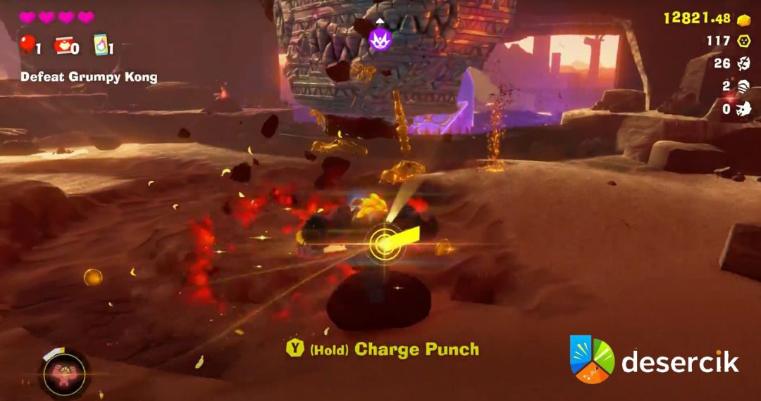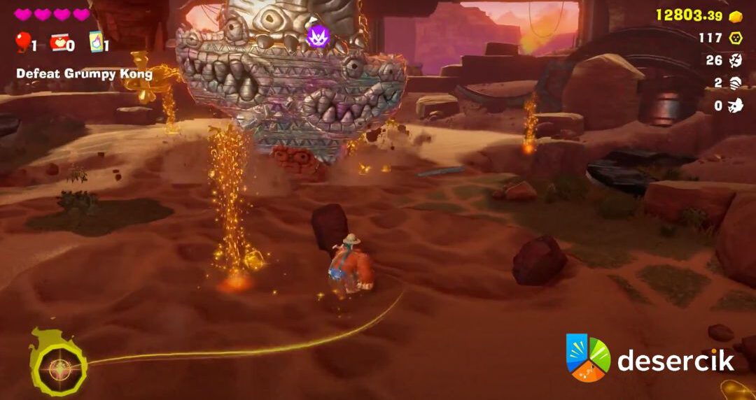 - Wspięcie się na szczyt: Użyj zdolności skoku lub wspinaczki, by dotrzeć do Grumpy Konga na górze posągu. Tam zacznij atakować go standardowymi ciosami. Obok jego imienia pojawi się fioletowy pasek zdrowia, pokazujący, ile obrażeń może jeszcze przyjąć.