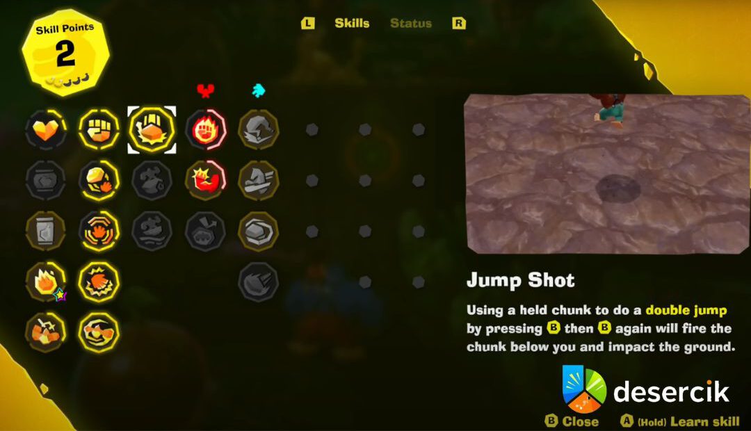 - W menu umiej臋tno艣ci znajd藕 opcj臋 Jump Shot i odblokuj j膮, wykorzystuj膮c jeden punkt umiej臋tno艣ci. To niewielka inwestycja, kt贸ra znacz膮co u艂atwia eksploracj臋, szczeg贸lnie w trudniejszych lokacjach, takich jak Nostalgia Country czy Thorny Hill Speed Surf, gdzie wiele przedmiot贸w jest umieszczonych poza standardowym zasi臋giem skoku.