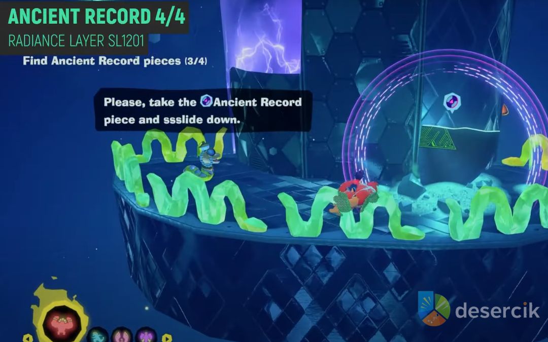 Ale zanim dostaniecie tę moc, musicie zebrać cztery części Radiance Ancient Record. W odróżnieniu od innych warstw, gdzie kawałki rekordu leżą sobie w otwartym świecie, w Radiance Layer każdy z nich jest zamknięty w osobnym pokoju wyzwań wokół Snake Elder. To jak cztery mini-poziomy, każdy z unikalnym klimatem i mechanikami, które przypominają zagadki z The Legend of Zelda. Żeby was naprowadzić, porozmawiajcie z wężowymi NPC-ami w okolicy – każdy wskaże wam drogę do jednego z wyzwań: Pitch-Dark Pit, Sizzling Sunbath, Sidewinder Slide i Slithery Zip Line. Gotowi? To wskakujcie w akcję, bo czeka was sporo skakania, uników i główkowania!