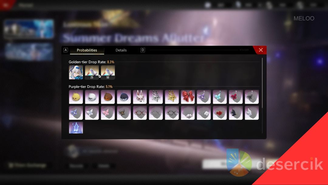 System pity jest bardzo ważny – po 10 losowaniach gwarantowana jest fioletowa rzadkość, a hard pity daje 25 Iridescent Prisms po 90 losowaniach. Prisms można wymienić na nagrody, takie jak stroje, bronie czy dodatki.