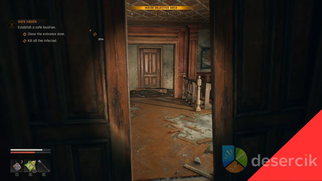 W środku kręci się kilku zarażonych, zwłaszcza w pobliżu drzwi, do których prowadzi znacznik misji. Na ziemi znajdziesz przynętę (Noisemaker) – gra pokaże ci krótki samouczek. Możesz użyć tego gadżetu, by odciągnąć potwory od wejścia, ale jeśli wolisz walkę, nic nie stoi na przeszkodzie, żeby po prostu wybić wszystkich.
