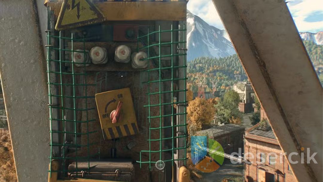 Na szczycie konstrukcji znajdziesz skrzynkę elektryczną. Twoim zadaniem jest jej uruchomienie – to właśnie ten moment, w którym cała bezpieczna strefa zacznie działać. Po włączeniu zasilania słup zamieni się w w pełni funkcjonalne schronienie:
