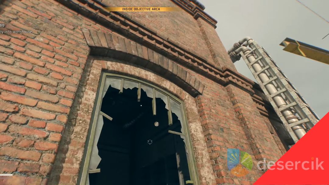 Stań przodem do magazynu (od strony kanału) i spójrz na jego lewą stronę. Zauważysz tam metalową konstrukcję z dźwigiem obok. Wespnij się po niej, a znajdziesz otwarte okno prowadzące do środka.