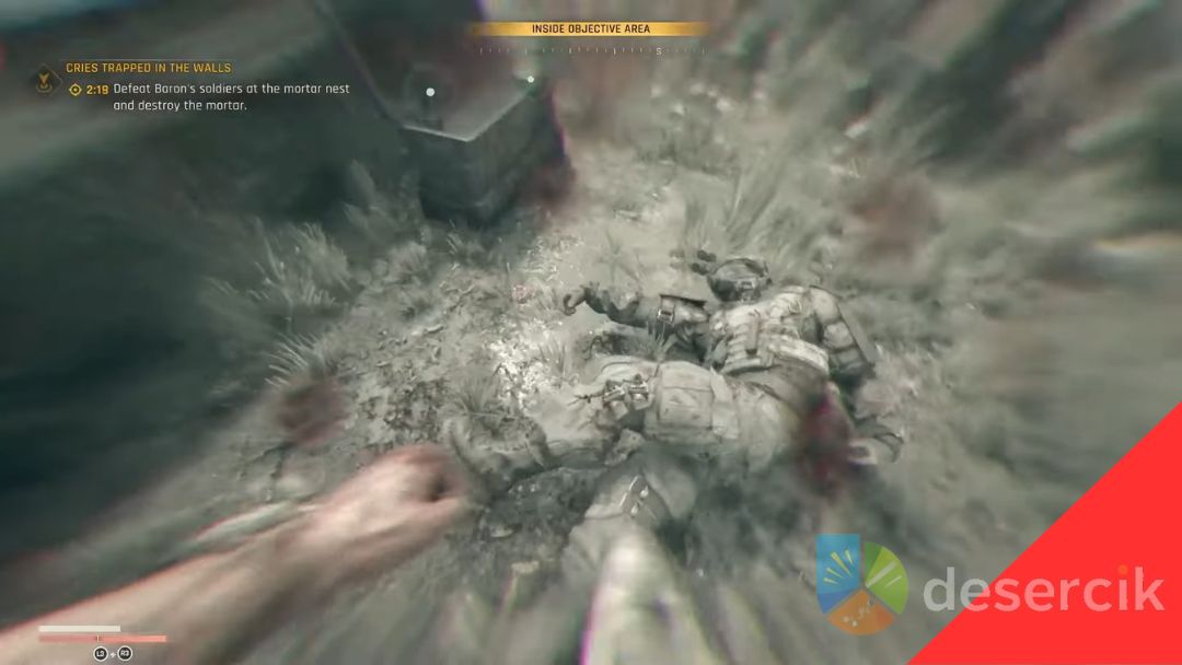 Po wyeliminowaniu żołnierzy musicie zniszczyć moździerze – jest ich kilka fal, więc shotgun jest tutaj bardzo pomocny. Następnie zbierzcie wszystkie granaty dymne, rozrzucone po placu, pamiętając, że pojawi się więcej zainfekowanych.