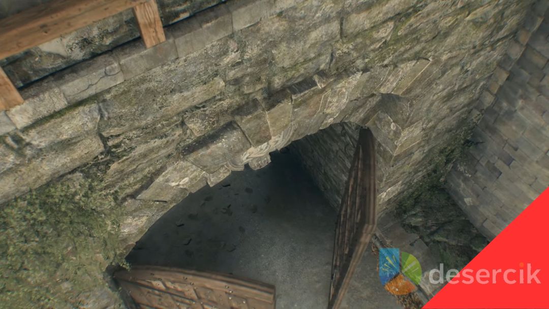 Po chwili dojdziesz do ślepego zaułka, ale na wprost znajdziesz ścianę do wspinaczki. Wspinaj się po kolejnych belkach i uchwytach – ścieżka prowadzi cię po zrujnowanych murach i drewnianych kładkach, aż w końcu wyjdziesz na zewnątrz, pod mury pałacu. Jeśli spadniesz, nie panikuj – w dole są kolejne uchwyty, które pozwolą ci wrócić.