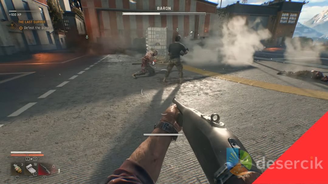 Najgroźniejszy ruch Barona to potężny skok – jeśli go zauważysz, wyskocz w chwili jego uderzenia lub wejdź na kontener, by uniknąć eksplozji. Trafienie potrafi zabrać nawet trzy czwarte twojego zdrowia.