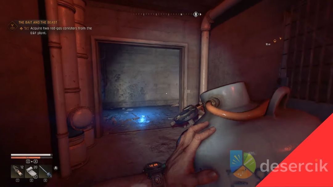 Najpierw udaj się z powrotem do strefy przemysłowej. Wejście do zakładu znajdziesz dokładnie tam, gdzie wcześniej walczyłeś z chimerą – przez zawalony fragment ściany. Po wejściu kieruj się w stronę drzwi z napisem Gate 2, a następnie zejdź schodami w dół. Nie używaj latarki, bo piwnica jest wystarczająco jasna.