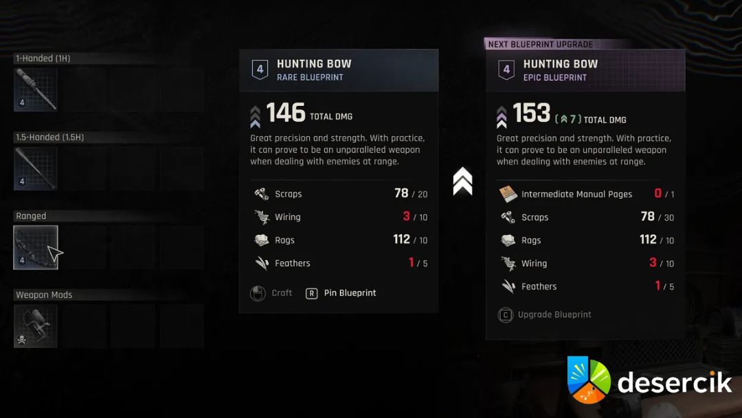 - Jeśli posiadasz odpowiednie surowce, możesz również ulepszać blueprint, co zwiększa statystyki powstałej broni przy każdym kolejnym wykonaniu.