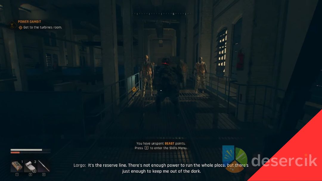 Zejdź przez wentyl, wpadniesz do sali pełnej Sleepers. Po ich pokonaniu, przeszukaj pomieszczenia – znajdziesz Mission Brief dla Major Jabłoński i zasoby. Następnie otwórz drzwi po prawej, by zejść schodami w dół do hatchu prowadzącego do sali turbin.