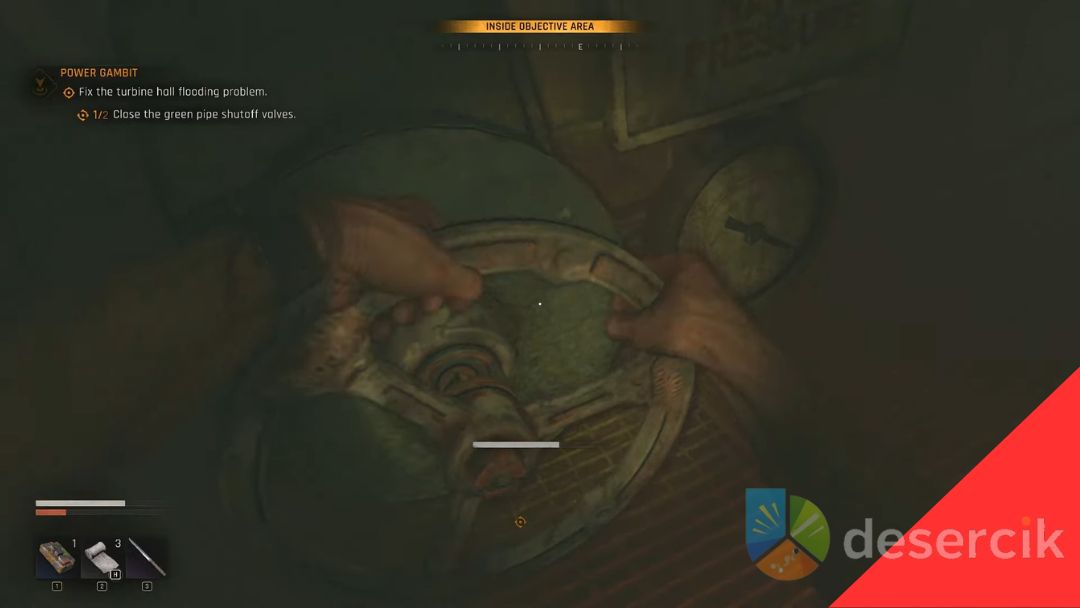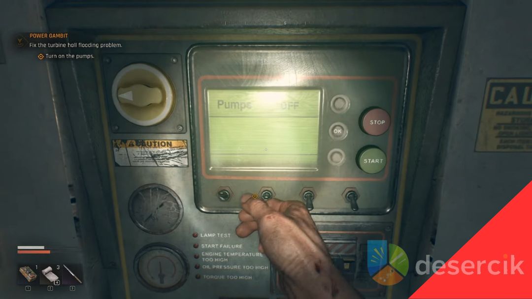 Wejdź do Control Room, ale nie ma prądu. W magazynie pokonaj zainfekowanych, przesuń regał, aby dostać się do wentylu i podłączyć przewód do konsoli. Teraz pompy działają, a woda dopływa do turbin.