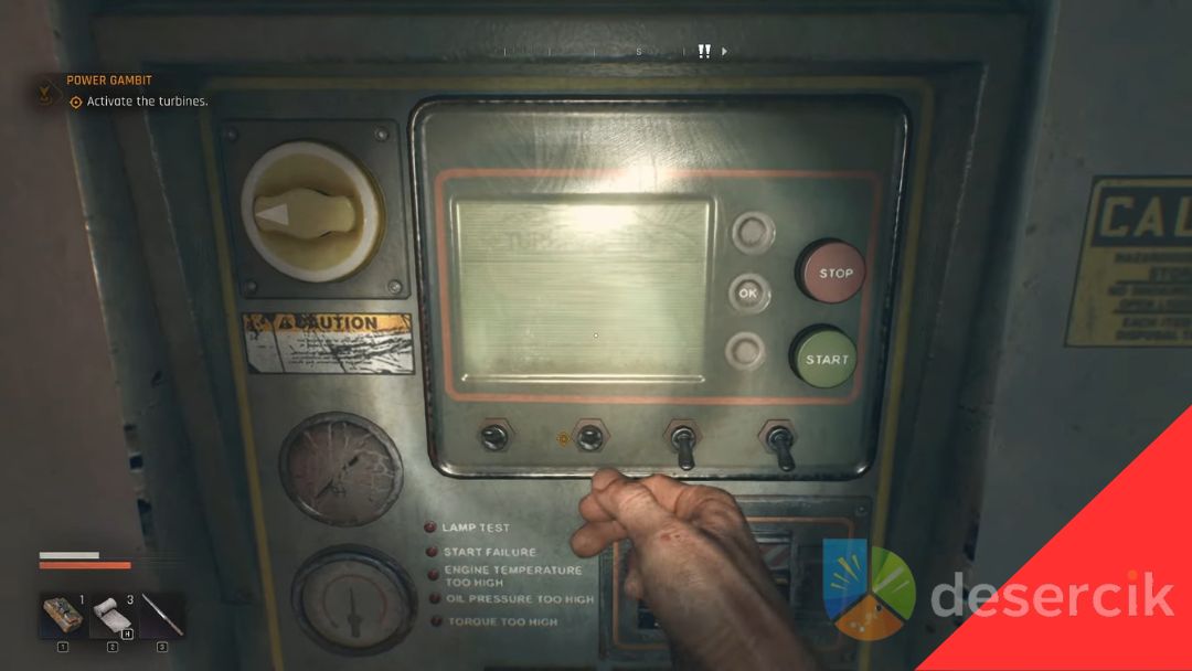 Musisz znaleźć klucz do zaworów w magazynie. Po zdobyciu, otwórz dwa czerwone zawory (1C i 2C), a następnie wróć do konsoli i uruchom turbiny – elektrownia odzyskuje pełną moc.