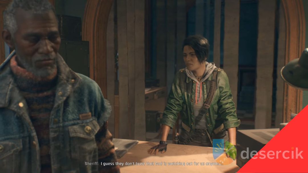 Najpierw idź do Town Hall, na dół do biura Sheriff – to drzwi, które zwykle są zamknięte w lobby. W środku spotkasz Szeryfkę i Jacoba, którzy omawiają krytyczny problem z prądem w mieście. Backupowe systemy działają chwilowo, ale nie można na nich polegać, bo nikt z zespołów wysłanych do elektrowni nie wrócił, a radio milczy.