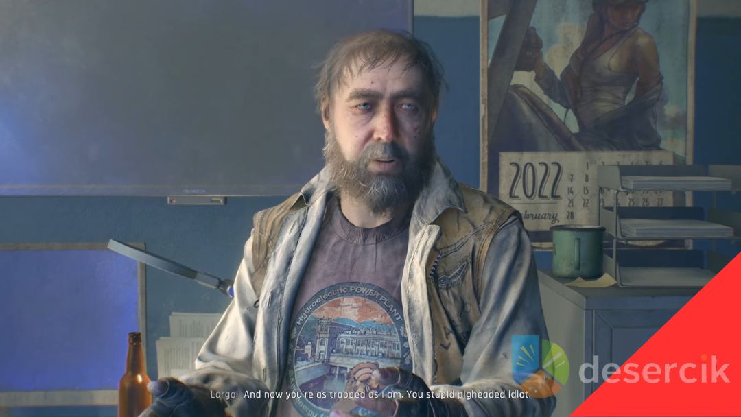 Largo, jest niechętny i marudny. Tłumaczy, że turbiny nie działają, stąd brak prądu. Wspólnie ustalacie, jak ruszyć dalej. Wyjdź przez okno na balkon, wejdź na rury i wróć na dach głównego budynku.