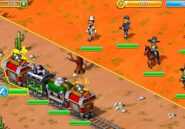 Ekran gry zostaje podzielony na dwie części, na jednej z nich do przodu przemieszcza się nasz szeryf, a na drugiej idzie bandzior. Turami obie postacie wymieniają się strzałami zadając przy tym określone obrażenia, oczywiście przed każdym strzałem musimy wycelować, głównie robimy to za pomocą myszki najeżdżając na ofiarę, a resztę załatwiamy kliknięciem. Strona, której skończy się życie przegrywa, ale już w trakcie walki możecie zauważyć, że z przeciwnika po udanym trafieniu wypada nam kasa i doświadczenie. Jeśli udało nam się wygrać pierwsze starcie (wierzę, że na pewno) to w nagrodę otrzymamy troszkę zielonych, świeżo drukowanych dolarów, kilka sztuk materiałów jak drewno itp. i losowy przedmiot (mi wypadła flaga).