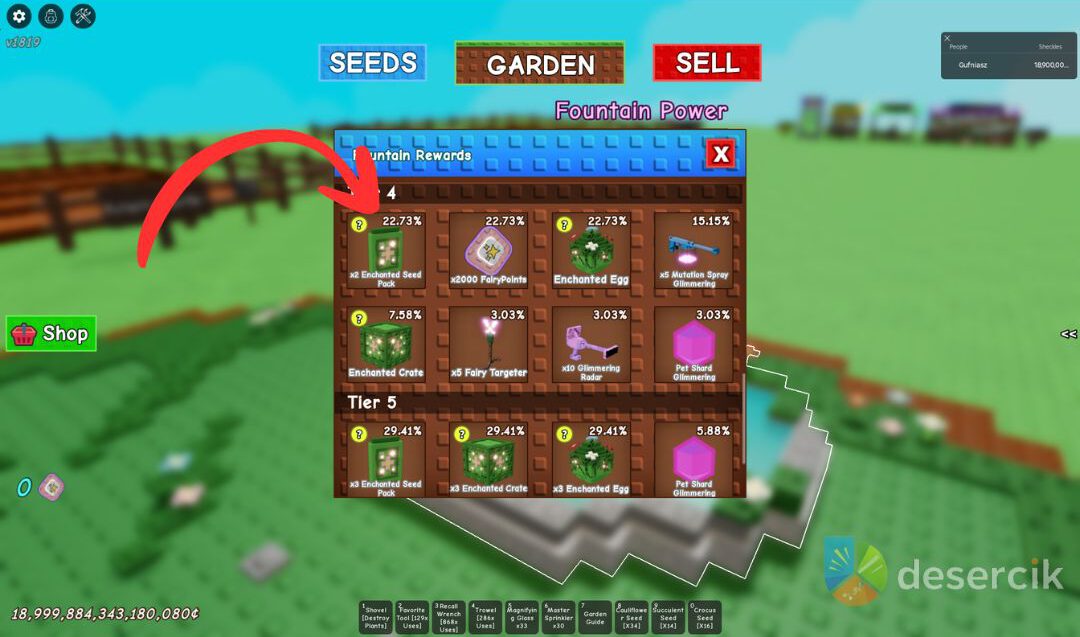 Dodatkowo, gracz może również wrzucać do studni owoce z mutacją Glimmering. Gdy licznik Fountain Power się napełni, Fairy Godmother spełni życzenie, które może obejmować Enchanted Seed Pack.