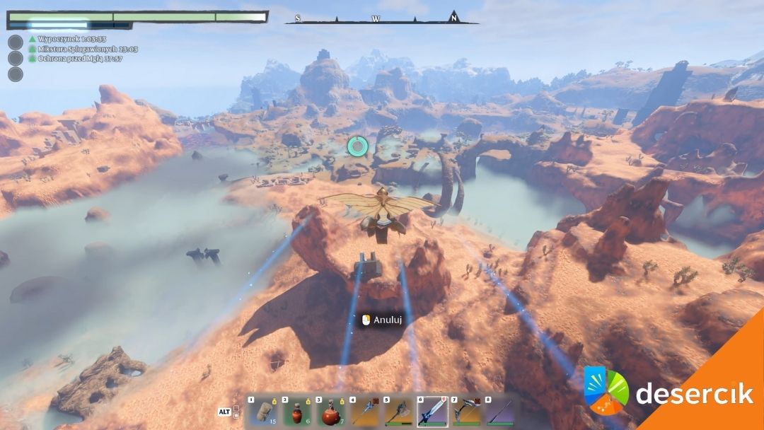 - Bezpieczne lądowanie – to kluczowe. Gdy wytrzymałość spada do zera, dezaktywuj Lotnię i aktywuj ją tuż przed upadkiem. Upadek z dużej wysokości kończy się śmiercią, więc lepiej nie ryzykować. To jeden z tych momentów, gdzie doświadczenie gracza naprawdę się liczy.