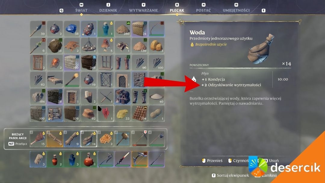- Woda – najprostsza i najłatwiej dostępna opcja. Nie tylko odnawia wytrzymałość, ale też podnosi Kondycję o 1, co zwiększa maksymalny poziom wytrzymałości o 10 punktów. Efekt utrzymuje się przez 10 minut, co jest wystarczające, żeby przebyć kawałek mapy i przygotować się na kolejne wyzwania.