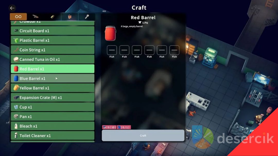 Złowione ryby zajmują dużo miejsca zarówno w magazynie, jak i w plecaku, dlatego dobrze jest zbudować specjalne beczki. W Workbenchu znajdziesz przepisy na czerwone, niebieskie i żółte beczki – każda ma inną pojemność.