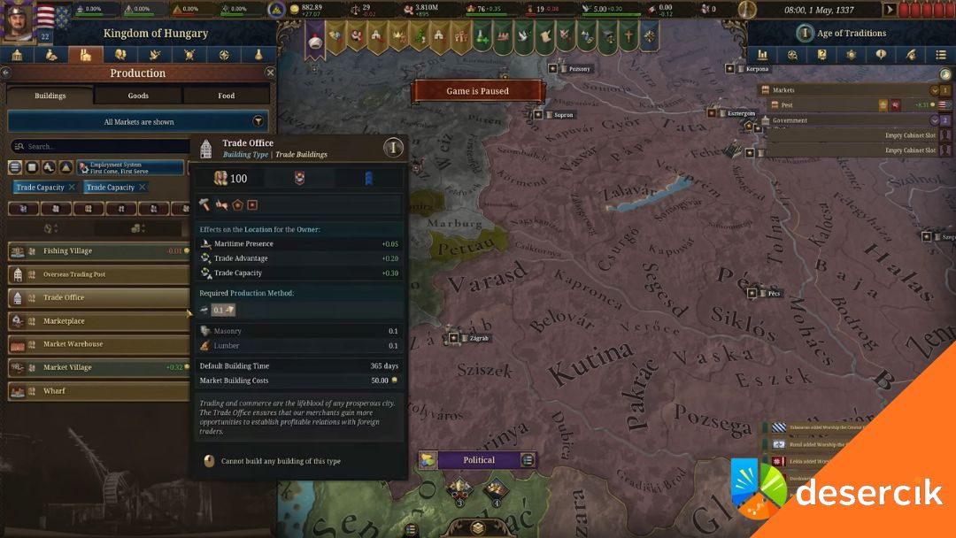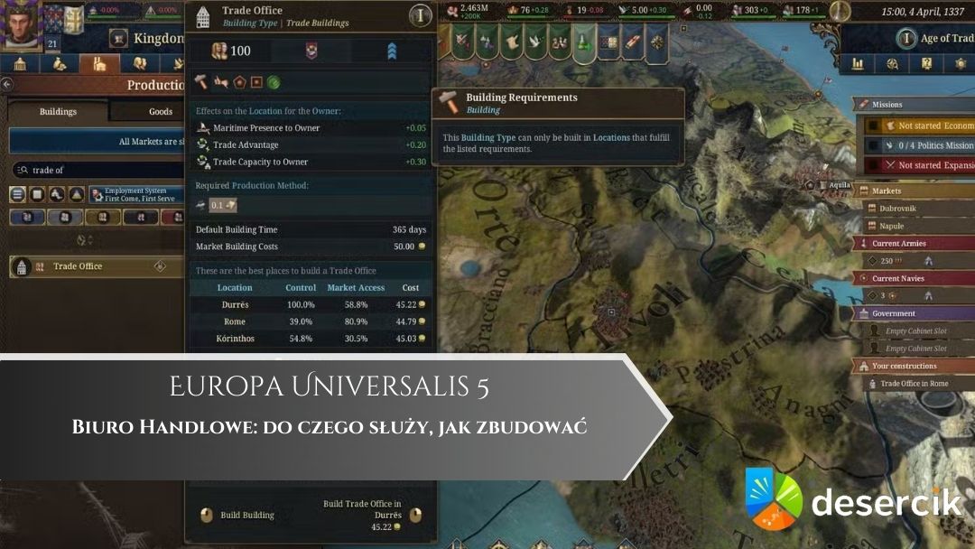 Jeśli dopiero zaczynasz swoją przygodę z Europa Universalis 5, prędzej czy później natrafisz na zagadkę związaną z Biurem Handlowym. Wielu graczy szuka tej konstrukcji w swoich prowincjach i za nic nie może znaleźć miejsca, gdzie dałoby się ją postawić. Wbrew pozorom to nie bug, tylko specyficzna mechanika – Biura Handlowe rządzą się zupełnie innymi zasadami niż klasyczne budynki.