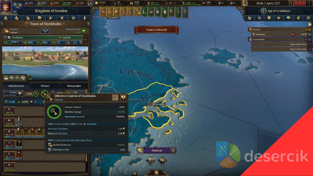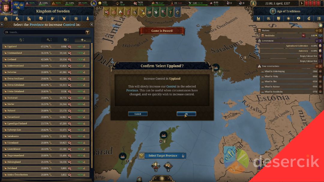 Każda lokalizacja w twoim kraju ma własny wskaźnik Kontroli, który zmienia się w zależności od różnych czynników. Wpływa on na podatki, pobór wojsk i rozwój ludności (Pops), więc warto stale go monitorować i ulepszać. W skrócie: im większa Kontrola nad danym miejscem, tym więcej możesz z niego wyciągnąć.