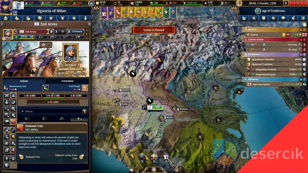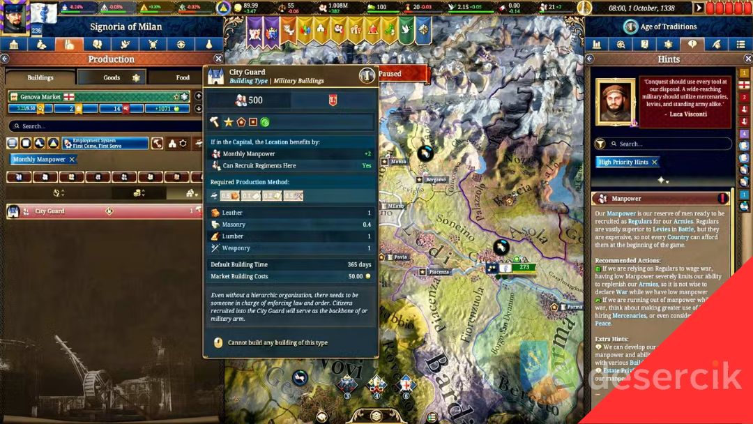 Każde państwo ma swój maksymalny limit Siły roboczej, który możesz sprawdzić, najeżdżając kursorem na ikonę tego zasobu. Jeśli jesteś na wyczerpaniu, pozostaje ci czekać, aż się odbuduje, zatrudnić Najemników, oprzeć się na Levy albo zakończyć konflikt pokojem, zanim sytuacja wymknie się spod kontroli.