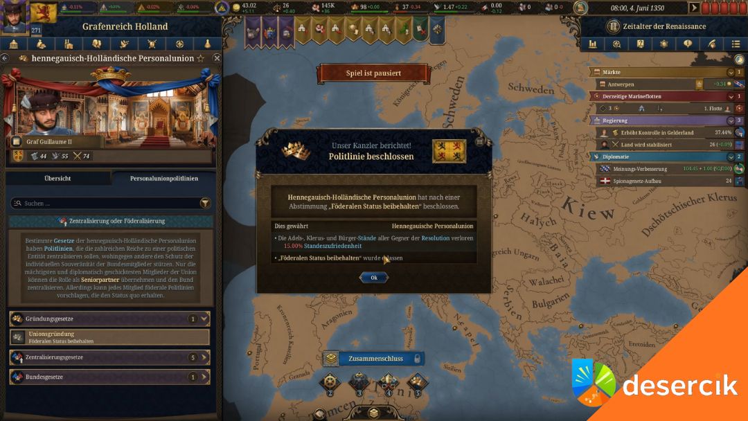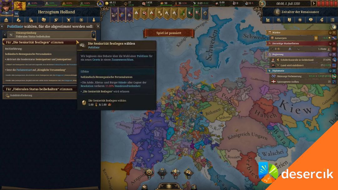 Od tego momentu senior będzie oznaczony na żółto, a juniorzy na niebiesko. Otworzy się też nowa zakładka Parlamentu Unii – tam dzieje się cała polityczna zabawa. Oba państwa dostają też nowe Casus Belli związane z Unią, więc pojawiają się dodatkowe możliwości działań dyplomatycznych i militarnych.