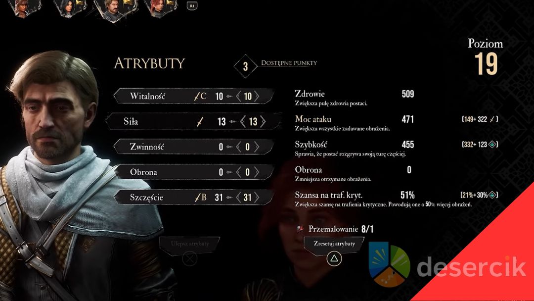 - Szybkość – wpływa na szybkość postaci i w mniejszym stopniu na obronę.