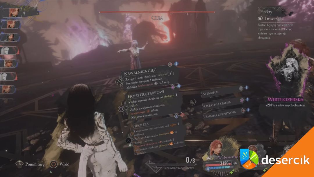 - Unikalny Pictos: Clea’s Life – jeśli postać nie została trafiona od ostatniej tury, zaczyna z pełnym HP. Połączenie z Cheater gwarantuje pełne leczenie przy dodatkowej turze.