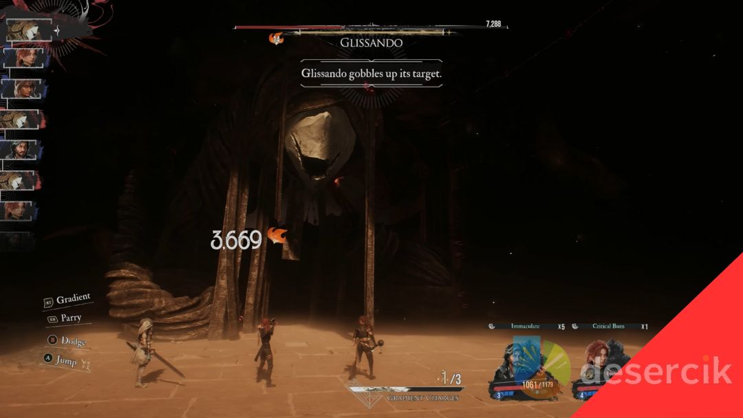 Najbardziej wkurzający atak. Glissando połyka jednego członka drużyny, który znika z areny. Tego uniknąć się nie da. Jedyny sposób na odzyskanie sojusznika to ogłuszyć bossa – czyli szybko przełamać jego obronę.