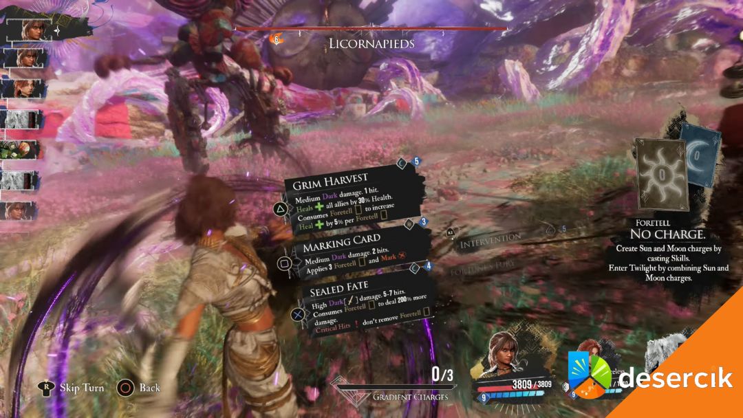 Flying Attack – Licornapieds wzbija się w powietrze, przelatuje nad drużyną i nurkuje w ziemię, zadając obrażenia wszystkim naraz.