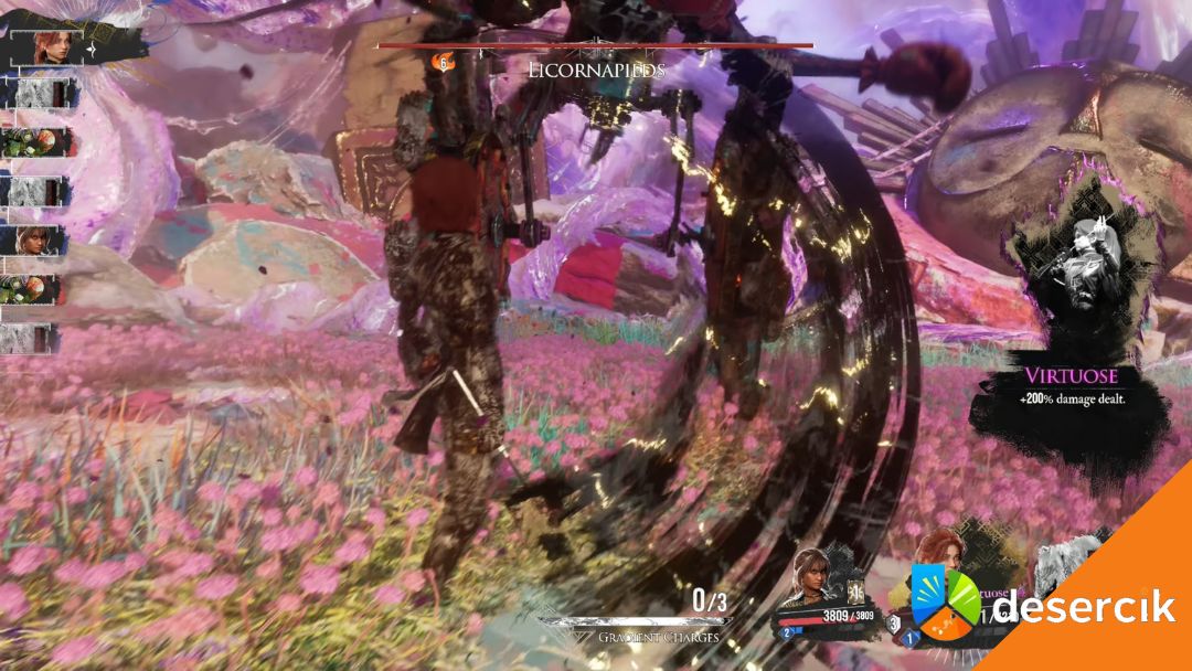 Licornapieds to dość dziwna, ale groźna hybryda w Clair Obscur: Expedition 33. Łączy w sobie cechy Machinapieds i Licorne, więc już na pierwszy rzut oka widać, że czerpie ataki z obu tych przeciwników. Z jednej strony mamy długie, mechaniczne serie ciosów, z drugiej tęczowe pociski i potężne uderzenia znane z Licorne. Do tego dochodzi jeszcze irytujący debuff Barbapapa, który potrafi kompletnie zepsuć tempo walki.