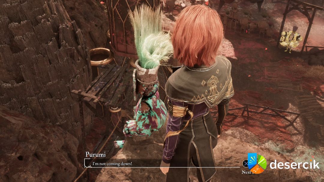 Jeśli nie porozmawiałeś wcześniej z Alexsoundro, dziecko nie zejdzie, choćbyś próbował sto razy. Dopiero po wykonaniu dialogu wróć tu ponownie – wtedy Purumi w końcu postanowi zejść.