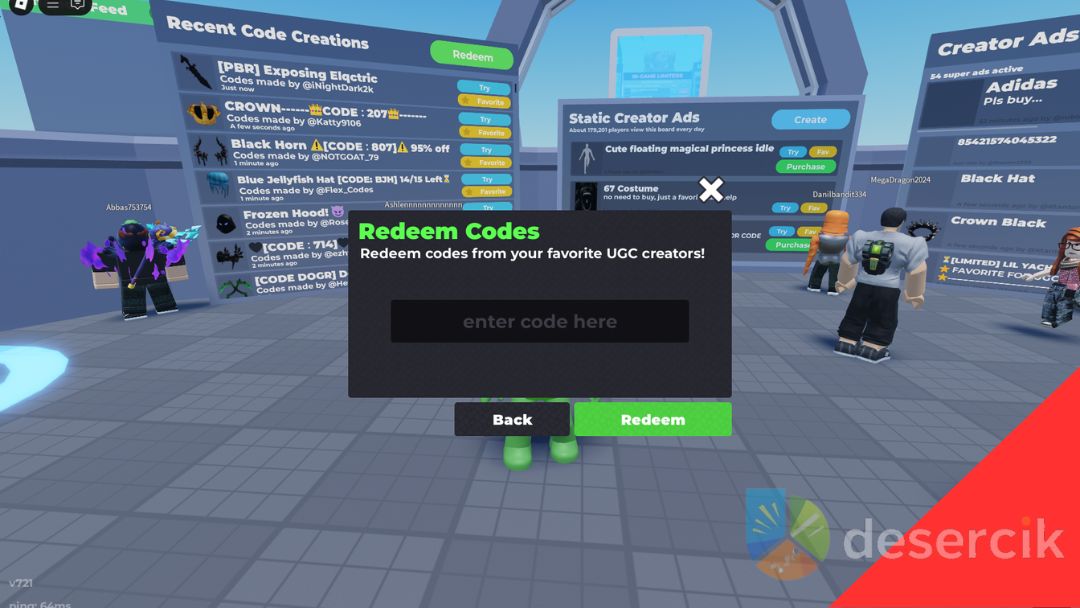 Odbieranie kodów jest bardzo proste, nawet jeśli dopiero wchodzisz do świata UGC. Po wejściu do doświadczenia od razu pojawia się okno do wpisania kodu, ale jeśli go nie zauważysz, zawsze możesz skorzystać z przycisku Redeem a Code. Wystarczy skopiować kod z listy działających i wkleić go w polu, a następnie kliknąć Redeem – nagroda od razu pojawi się w twoim ekwipunku. Pamiętaj, że kody mogą szybko wygasać, bo dostępność przedmiotów czasem jest limitowana przez twórców lub liczba kopii się kończy, więc najlepiej wykorzystać je od razu.