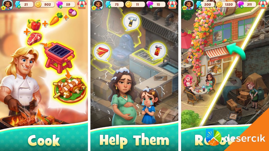 Foodstars: Merge & Cook to gra, która idealnie trafia w marzenia wszystkich, którzy choć raz pomyśleli: „kurczę, fajnie byłoby prowadzić własną restaurację i gotować jak prawdziwy mistrz”. Od samego początku czuć, że to nie jest zwykły merge z jedzeniem w tle, tylko pełnoprawna kulinarna przygoda, w której krok po kroku wspinasz się na gastronomiczny szczyt.
