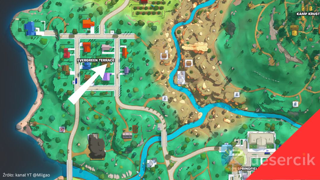 Aby znaleźć Dom Simpsonów, należy udać się do centrum punktu Evergreen Terrace POI, po lewej stronie mapy Springfield Island. To właśnie tam stoi charakterystyczny budynek o brązowych ścianach i dachu, tuż obok domu Neda Flandersa z jego fioletowym zadaszeniem.