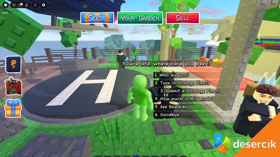 Po rozmowie szybko dowiesz się, że interesują ją wyłącznie Strange Plants. Oddajesz je pojedynczo, a w zamian dostajesz punkty i nagrody. Nie ma możliwości przekazania wszystkiego naraz, więc przy większej liczbie plonów trzeba poświęcić chwilę.