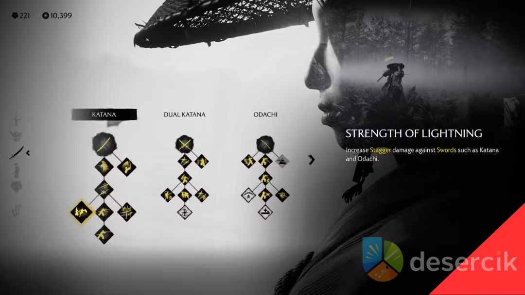 To technika, którą pokocha każdy, kto preferuje klasyczną walkę kataną. Strength of Lightning zwiększa obrażenia zadawane ciężkimi atakami, zwłaszcza w pojedynkach z innymi wojownikami używającymi katany lub odachi.