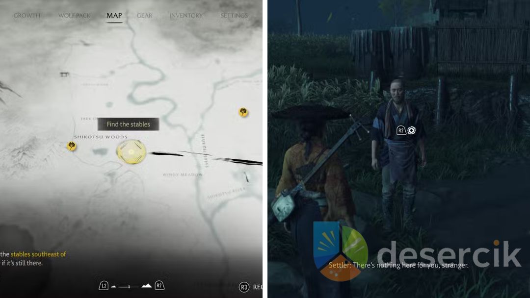 Kolejny krok to podróż do Starych Stajni w południowo-wschodniej części lasów Shikotsu Woods. To dość długa droga z domu Atsu, więc przygotuj się na wędrówkę. Po dotarciu na miejsce zobaczysz dwóch bandytów znęcających się nad koniem. Trzeba ich pokonać, a następnie podążyć za zwierzęciem, które ucieknie w stronę stajni.